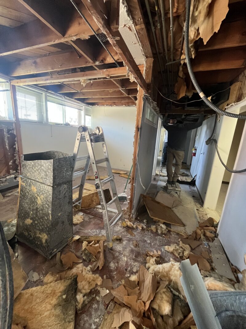 Along with asbestos abatement has been the commencement of comprehensive cosmetic upgrades throughout 6,000 sq ft of building. And wow, we found some interesting things inside the walls. Buried electrical, hidden junctions, abandoned pipes, walls that stopped short of the ceiling, the evidence of leaks with rusted joist hangers to boot. It’s the archeological evidence of jobs done quick and dirty, or perhaps “budget friendly” is the charitable way of putting it. What began as a simple solution had grown into a complex, tangled mess. It was “fine” as long as you just leave it as it is, for as long as you can, until the wheels come off.