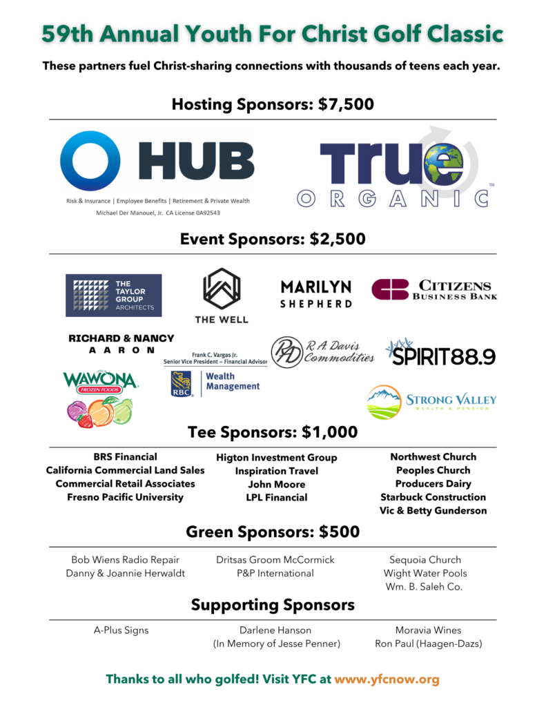 YFC events like the YFC Golf Classic, Campus Life 5k and Kid’s Fun Run, and the Fall Banquet are great ways to publicly show support while fueling the mission of YFC.